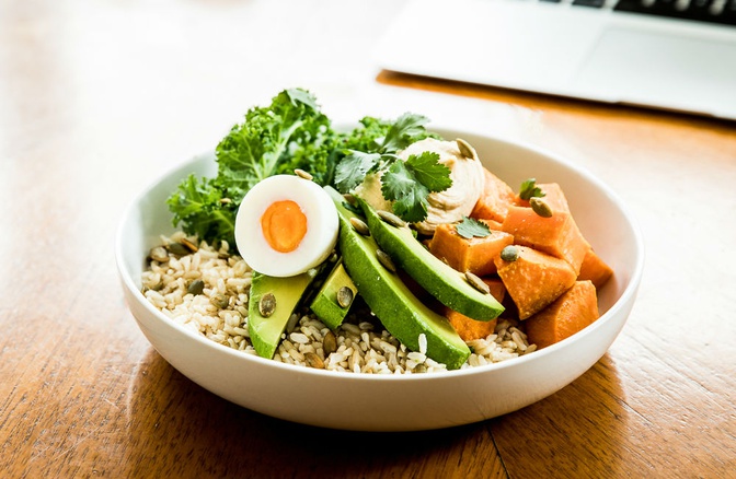 Add kale, sweet potato, grain, eggs and avocado to a bowl. Top with pumpkin seeds and hummus. Garnish with coriander.